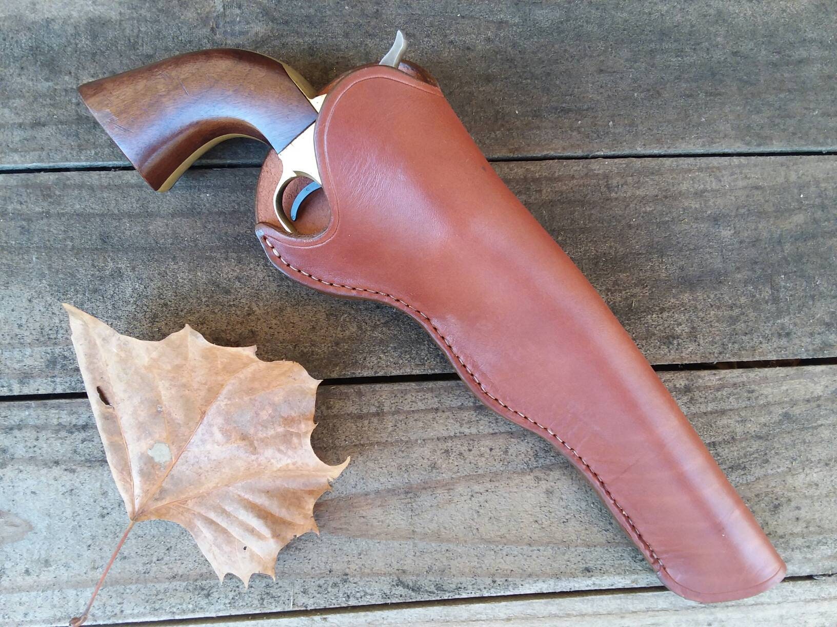 This holster is made for the Colt Navy Revolver and similar reproductions. It is made in the historically accurate style of the California Slim Jim, which was the common style of holster for the early black powder revolvers. This one is made very similar to pictures we have found of the holsters used by American folk hero and lawman, "Wild Bill" Hickok.